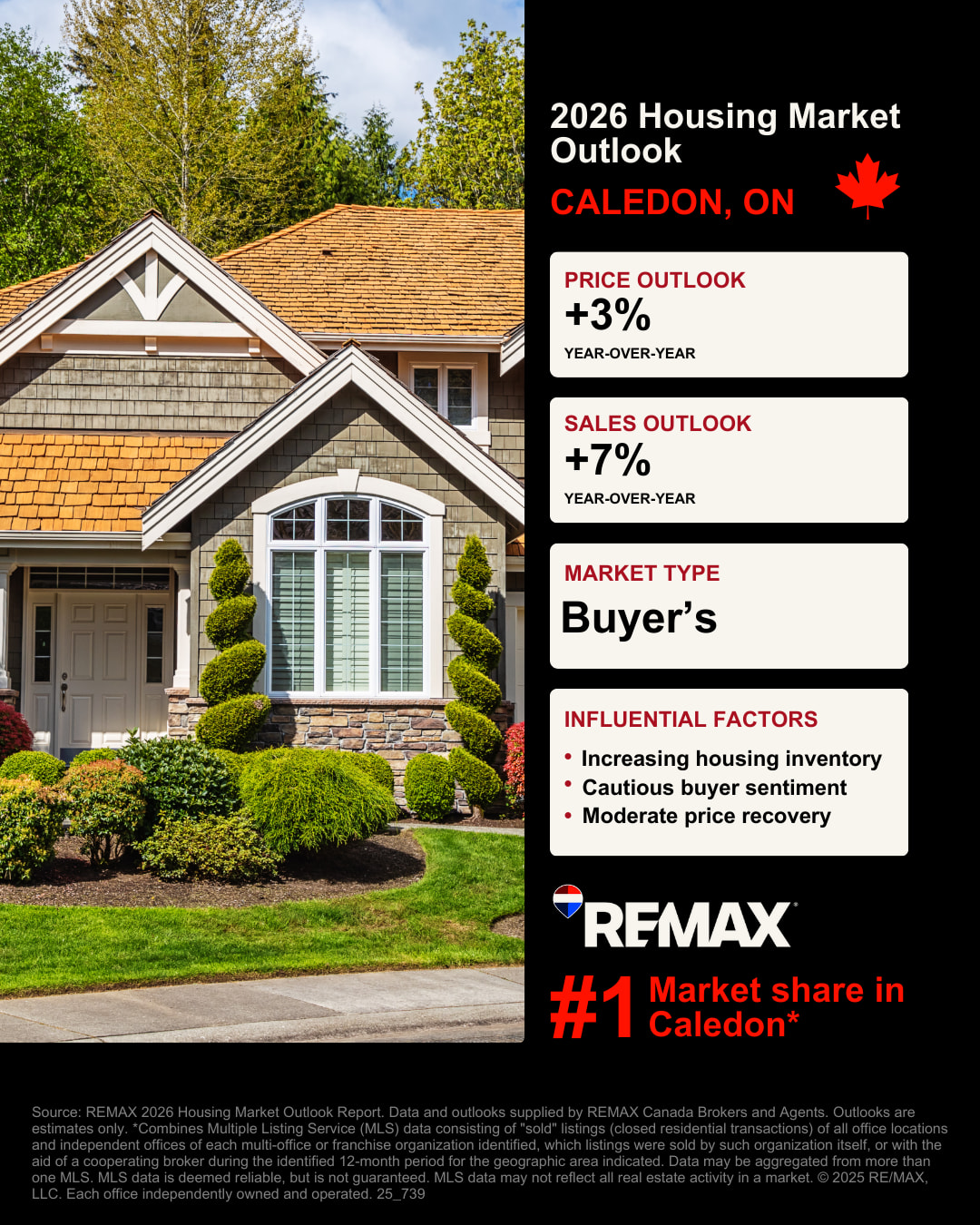Average residential sale prices will increase by three per cent going into 2026, compared to 2025. Sales are anticipated to rise by seven per cent going into 2026, compared to 2025. Looking ahead to 2026, Caledon will continue to be a buyers with an increase in inventory and lowering interest rates sparking more movement within the market.