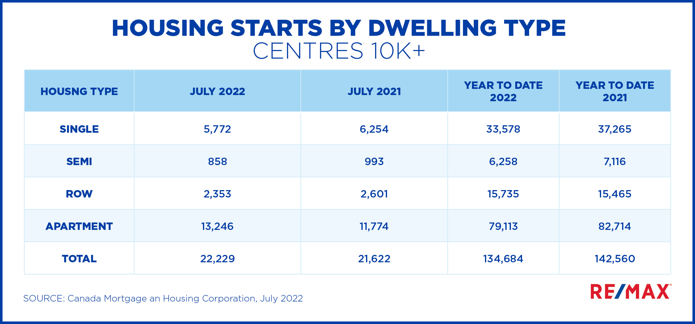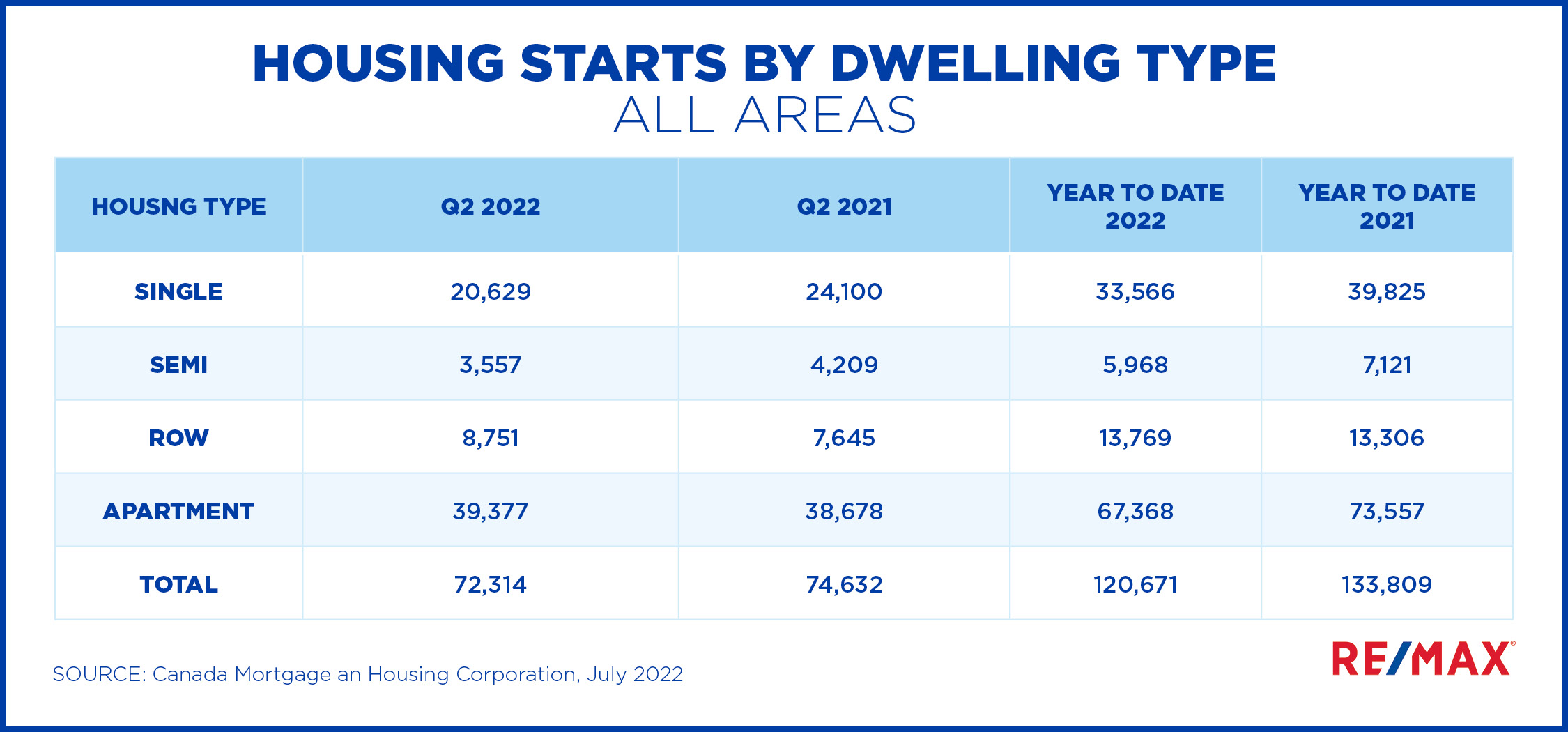 “Current market realities have upended the economic viability of many developments, causing new residential projects to be cancelled or put on hold indefinitely,” says Elton Ash, Executive Vice President, RE/MAX Canada. “The feasibility of many new or planned housing starts is now in question, but the ones that already had smaller margins—affordable housing and starter homes—are at the top of the chopping block. If we’re already experiencing an inventory crisis, what will the consequences be when demand rebounds?”