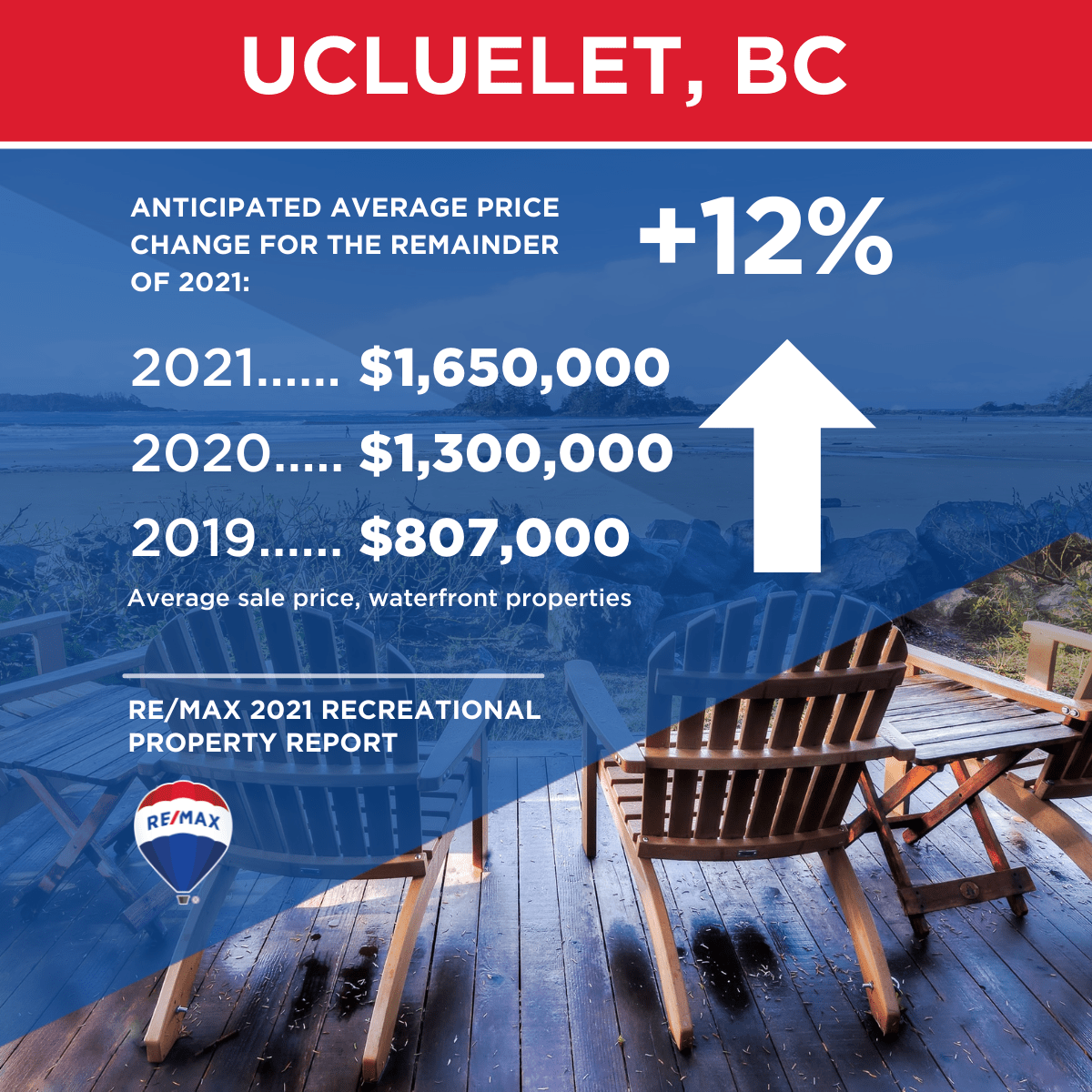 The anticipated price growth for recreational properties in Tofino and Ucluelet over the remainder of 2021 is an increase of +12% for waterfront and +6% for non-waterfront homes.